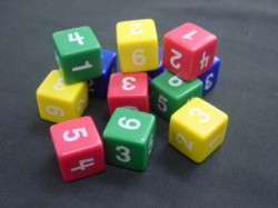 A set of twelve pieces bright colored number cubes printed with bold numbers from 1 to 6.